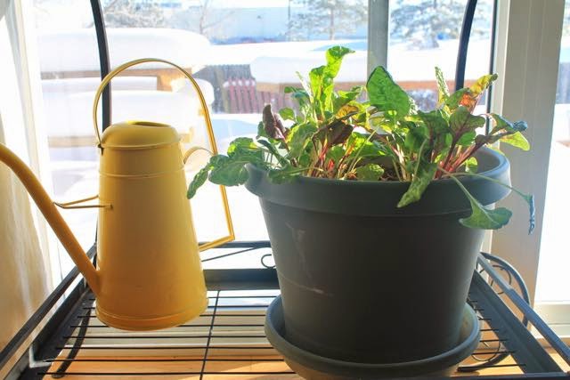 I really like getting to experience all four distinct seasons every year in Colorado. In winter, it snows and it feels like winter. We were extra lucky this year an it snowed like crazy all day on Christmas day. So pretty. But in the middle of all that sparkly white, I really miss my garden. So this year at the end of the growing season, before the first bad frost, we decided to set up a little indoor garden to keep us going through the winter. I set up this little cart with just a few pots and it just makes the house feel like the garden is continuing to grow. If you don't have a cart or side table, you could take the back off a cheap book shelf to make an open shelving area for plants. Our kitchen has an east-facing glass door, so it gets a good amount of morning sun. We brought in our stevia and swiss chard pots and started baby lettuce in the window box. Thing Two calls stevia "the candy plant" and is constantly sneaking a leaf to just chew on. It's kind of a miracle there are any leaves left, but the plant is taller than he is, so you can pretty much measure his reach by where the leaves are still growing. Like the trees that surround giraffes at the zoo. : )